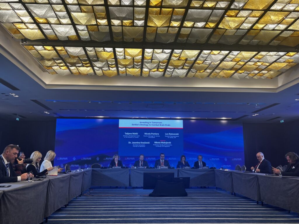 Panel diskusija o odlasku mladih i radne snage otvorio je pitanje održivosti dosadašnjeg ekonomskog modela Srbije, a na kojem su govorili Tatjana Matić, direktorka Fonda za razvoj Republike Srbije, Jasmina Knežević, osnivačica Belmedic, Nikola Pontara, rukovodilac za Srbiju, Svetska banka i Lev Ratnovski, stalni predstavnik za Srbiju, Međunarodni monetarni fond.