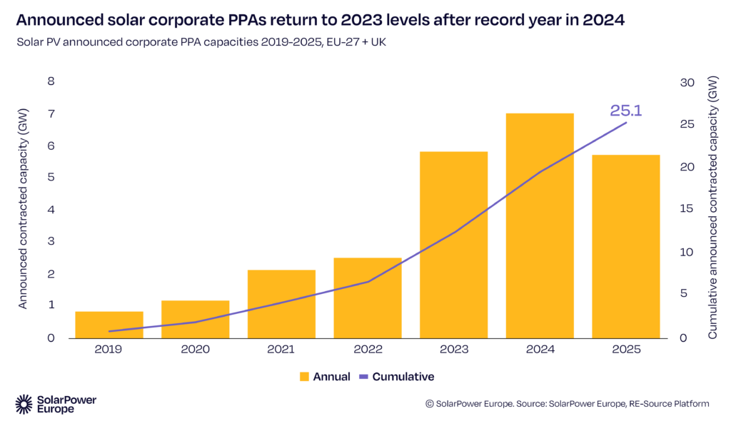 SolarPower Europe objavio je novi izveštaj „Aukcije i korporativni PPA ugovori: Pregled evropskog tržišta 2025“ koji pokazuje da su javne aukcije i korporativni ugovori o otkupu električne energije (cPPA) obezbedili 92 GW novih solarnih kapaciteta u EU između 2022. i 2025. godine. Takvi kapaciteti mogu da pokriju potrebe za električnom energijom 28 miliona domaćinstava, što je više od deset odsto ukupnog broja domaćinstava u Evropi.