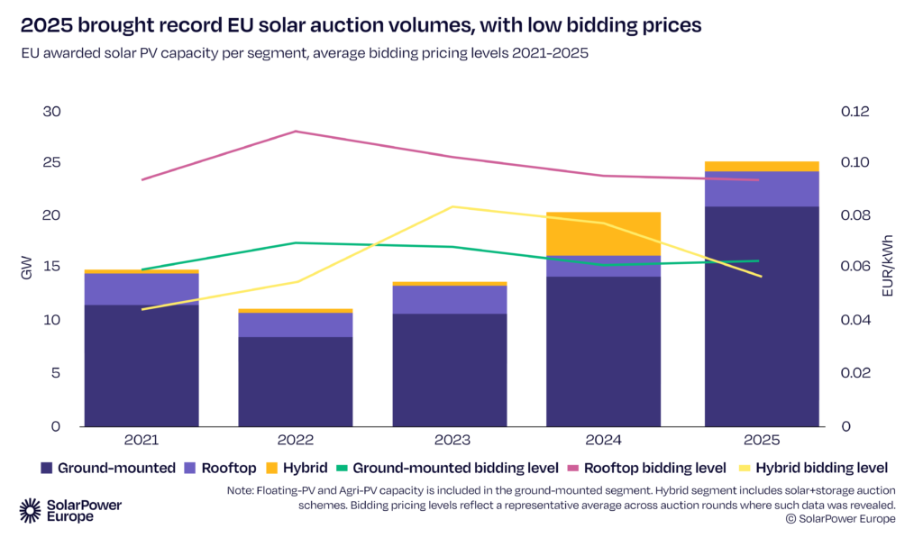 U periodu 2022–2023 solarne aukcije u EU beležile su slabije rezultate, ali su se u 2025. godini dostigle rekordnih 25,2 GW, što je rast od 23% u odnosu na prethodnu godinu. Ipak, gotovo polovina aukcija i dalje privlači manje ponuda od raspoloživog kapaciteta, što ukazuje na propuštene prilike za brže širenje obnovljivih izvora.