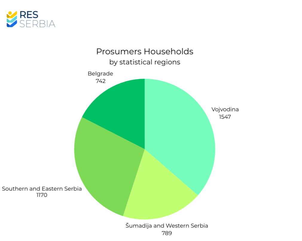 Vojvodina leads by number of household prosumers, with 1,547 registered users, accounting for 36.42% of the total. It is followed by Eastern and Southern Serbia with 1,170 households (27.60%), Šumadija and Western Serbia with 787 (18.52%), and Belgrade with 742 households (17.47%).
