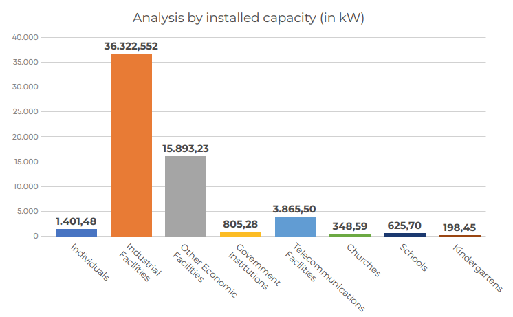 In its first analysis in April 2024, the Association of RES Serbia placed special emphasis on the category of Other prosumers. Most of them are telecommunications facilities, of which there are 362 with an installed capacity of 3.9 MW, with the largest installed capacity, almost 36.3 MW, going to 223 industrial facilities. Other economic facilities are significant in number, including markets, restaurants, shopping malls, and other businesses, of which there are 470 with 15.9 MW of installed capacity. Only 26 registered producers are state institutions, with less than 1 MW of installed power, while 18 churches, 17 schools and 7 kindergartens are also in this category.