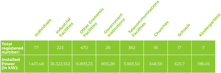 The total number of registered prosumers by this category, with their total installed power (in kW) can be found in the table below:
