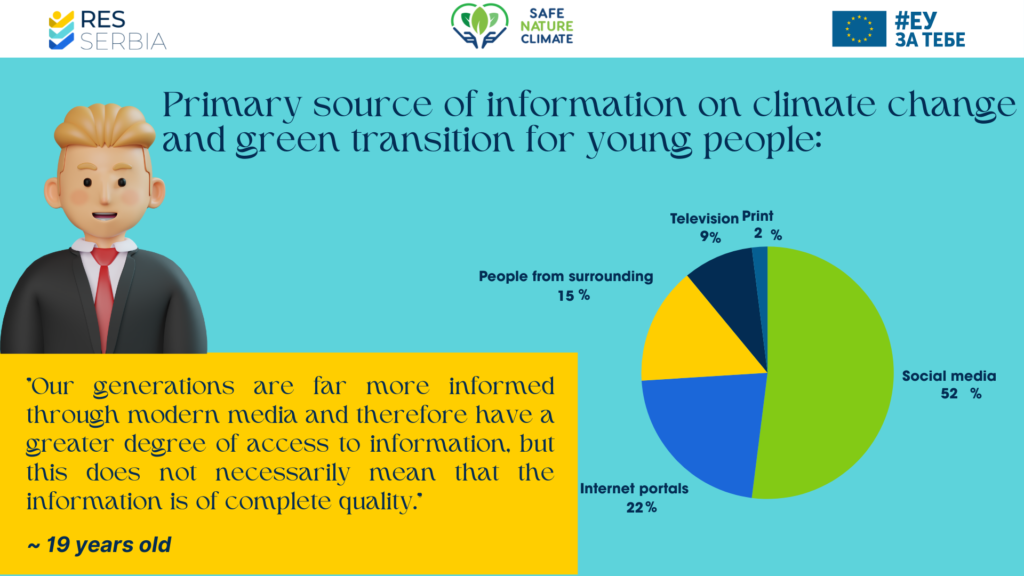 When it comes to information about climate change and the green transition, the majority of young people in Serbia (52%) rely on social networks, while 22% use internet portals as a source of information. Overall, as many as 3⁄4 of young people use modern digital media to get information about these topics.
