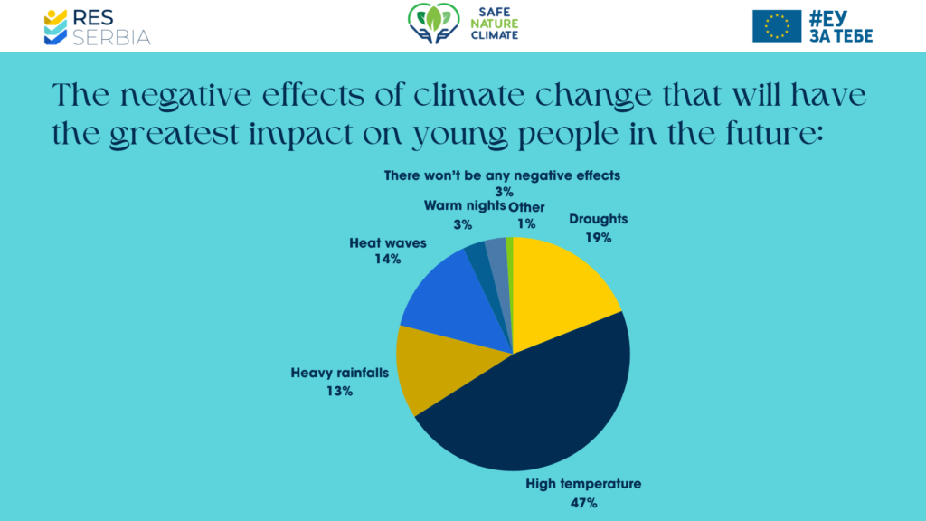 The largest number of young people (47%) single out high temperatures as the effect of climate change that will have the greatest negative impact on future generations of young people in Serbia. For 19% of young people, the greatest negative impact will be droughts, for 14% it will be heat waves, and for 13% heavy rainfall.