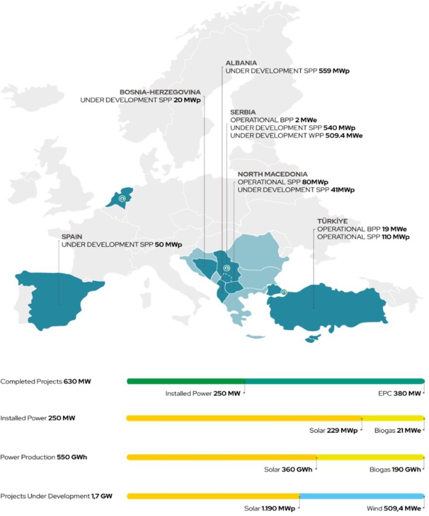 Širom jugoistočne Evrope, Fortis generiše 360 GWh električne energije godišnje iz svojih solarnih elektrana sa ukupnim instaliranim kapacitetom od 229 MWp. Pored ovog portfelja, pet termoelektrana na biogas koje rade punim kapacitetom u Turskoj i Srbiji godišnje proizvedu preko 190 GWh energije sa ukupnom instalisanom snagom od 21 MWe.