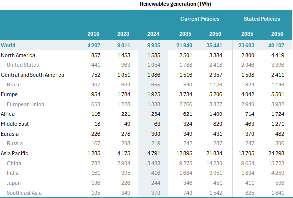 Ako se trenutne energetske politike ne promene, očekuje se da će proizvodnja iz obnovljivih izvora porasti na 21.940 TWh do 2035. godine, a 2050. godine do 35.441 TWh. Međutim, u slučaju ambicioznijih klimatskih politika, taj broj bi mogao dostići čak 40.107 TWh 2050. godine.