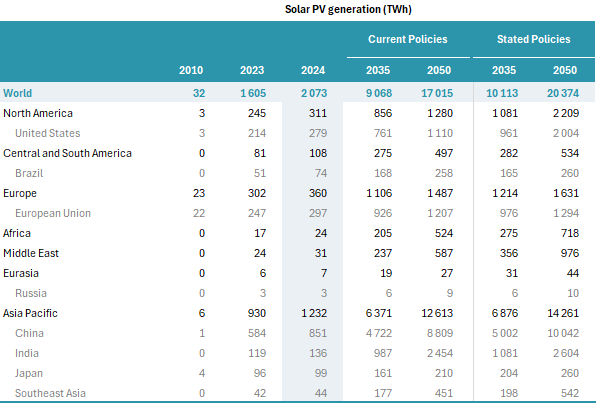 Ukoliko se trenutne energetske politike ne promene, očekuje se da će solarna proizvodnja dostići 9.068 TWh do 2035. godine, odnosno na 17.015 TWh 2050. godine. Međutim, uz ambiciozne klimatske mere, proizvodnja solarne energije mogla bi dostići 20.374 TWh do 2050. godine.