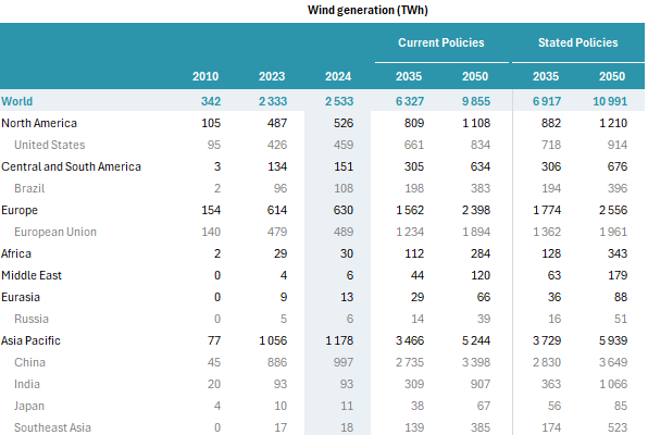 Ako se postojeće energetske politike zadrže, očekuje se da će vetroelektrane do 2035. godine generisati 6.327 TWh, dok bi do 2050. taj broj mogao dostići 9.855 TWh. S druge strane, uz unapređenje klimatskih politika, proizvodnja bi mogla porasti na 6.917 TWh do 2035. godine, a do 2050. godine čak na 10.991 TWh.