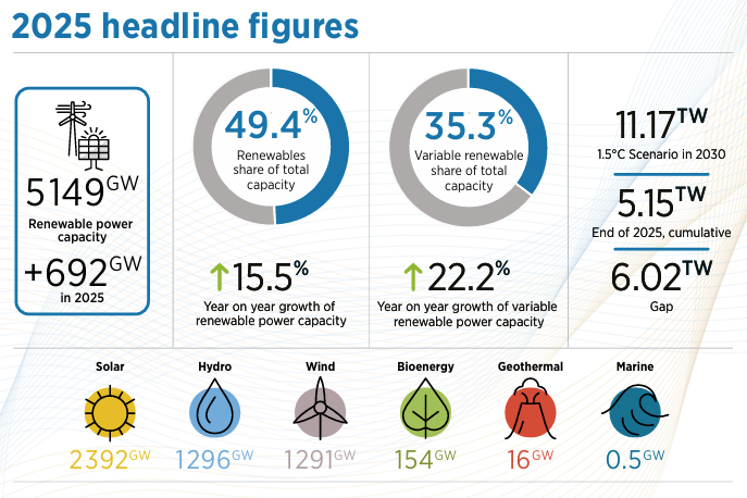 IRENA navodi da je 2025. godina obeležila najveći godišnji rast obnovljive energije do sada, kako u apsolutnim brojkama, tako i u procentima, ali da je i dalje potrebno značajno ubrzanje kako bi se ostvario cilj usvojen na COP28: utrostručenje kapaciteta do 2030. godine, odnosno više od 11 TW instalisane snage.
