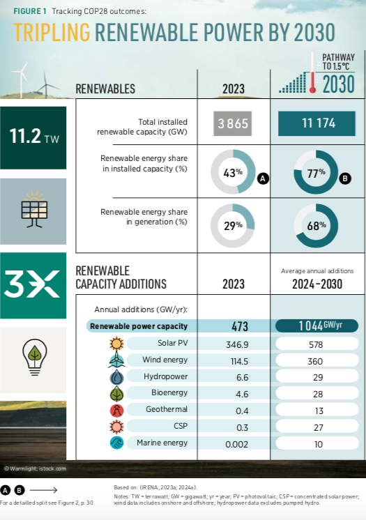Utrostručenje kapaciteta obnovljive energije na 11,2 TW zahteva prosečan godišnji rast od 1.044 GW u periodu od 2024. do 2030. godine, što predstavlja godišnju stopu rasta od 16,4%, jedan je od zaključaka izveštaja „Ispunjavanje UAE konsenzusa: Praćenje napretka ka utrostručavanju kapaciteta obnovljive energije i udvostručavanju energetske efikasnosti do 2030. godine“.