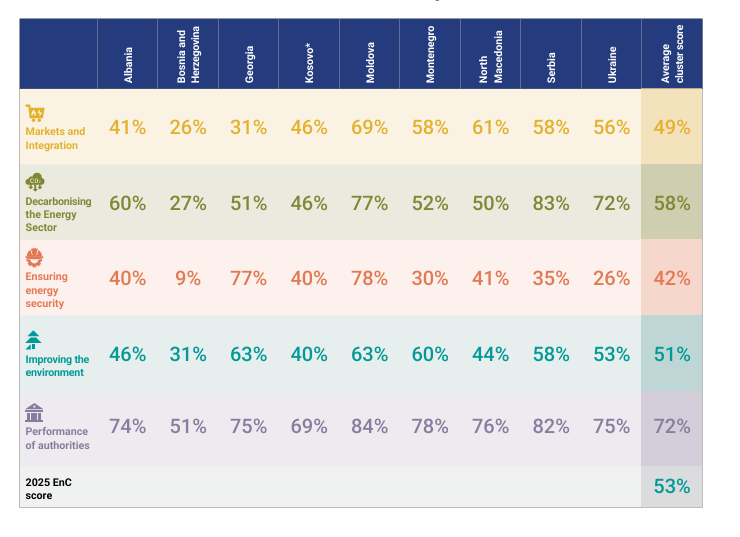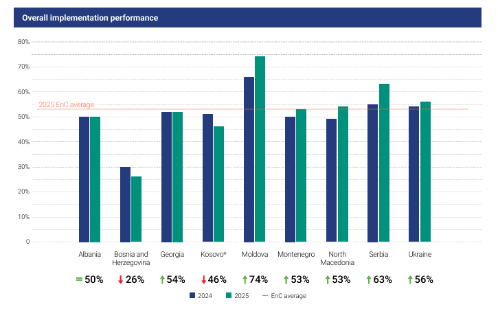 Albanija i Gruzija ostale su uglavnom stabilne, sa ograničenim pomacima u pojedinim oblastima, dok su Bosna i Hercegovina i Kosovo* zabeležili pad zbog izostanka napretka u dekarbonizaciji i tržišnim reformama. Crna Gora je napravila važan korak napred usvajanjem novog Zakona o energetici, iako još uvek nije u potpunosti transponovala Paket za implementaciju Energetske zajednice (Energy Community Implementation Package – EIP).