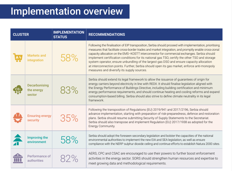 – Nakon transponovanja Uredbi (EU) 2019/941 i 2017/2196, Srbija treba da unapredi implementaciju, počevši od pripreme planova za spremnost na rizike, odbranu i obnovu. Srbija treba da nastavi sa podnošenjem Izjava o sigurnosti snabdevanja Sekretarijatu. Srbija takođe treba da transponuje i implementira Uredbu (EU) 2017/1938 kako je usvojena za Energetsku zajednicu – neke su od preporuka Sekretarijata Energetske zajednice.