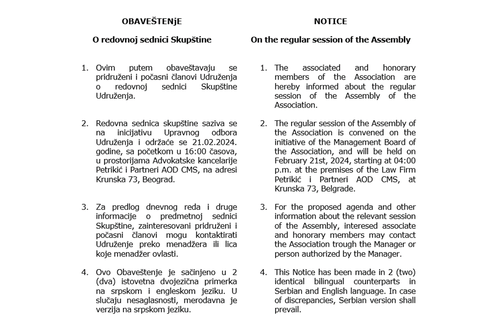 Redovna sednica Skupštine Udruženja OIE Srbija saziva se na inicijativu Upravnog odbora Udruženja i održaće se 21.02.2024. godine sa početkom u 16:00 časova u prostorijama Advokatske kancelarije Petrikić i Partneri AOD CMS, na adresi Krunska 73, Beograd. Za predlog dnevnog reda i druge informacije o predmetnoj sednici Skupštine, zainteresovani pridruženi i počasni članovi mogu kontaktirati Udruženje.