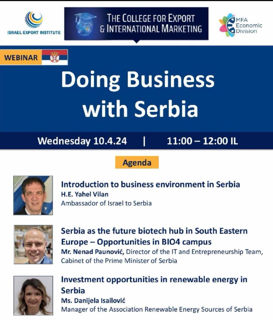 Menadžerka Udruženja OIE Srbija, Danijela Isailović, učestvovala je na današnjem vebinaru koji je organizovala Ambasada Izraela u Beogradu na temu „Poslovanje sa Srbijom“. Vebinaru koji je pružio potencijalnim investitorima iz Izraela uvid u poslovne prilike i perspektive u Srbiji, prisustvovalo je 120 učesnika iz 60 izraelskih kompanija.