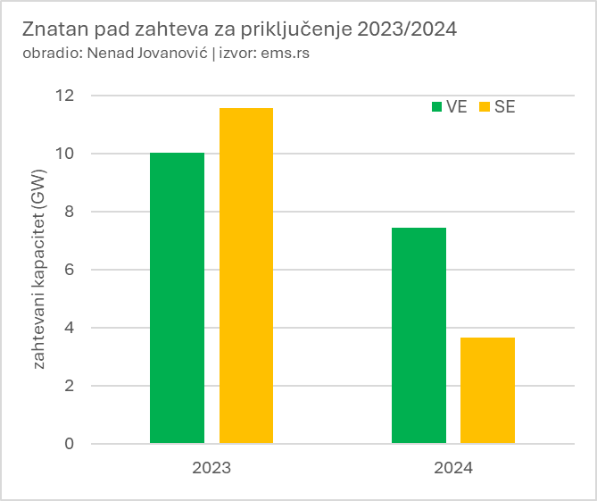Zahtevi za priključenja najviše su redukovani u oblasti solara, te je od zahteva odustalo 7.9 GW, dok je zahtevani kapacitet vetroelektrana smanjen za 2.6 GW. Što se tiče priključenja, oko 1 GW kapaciteta je u završnoj fazi, uključujući već priključenu vetroelektranu Krivaču od 106 MW, koja se već nalazi u probnom radu. Dodatnih 1.4 GW ima ugovor o izradi planske i tehničke dokumentacije, ali velika većina se nalazi u ranoj fazi priključenja.