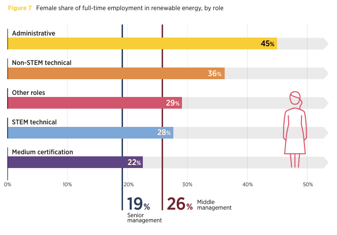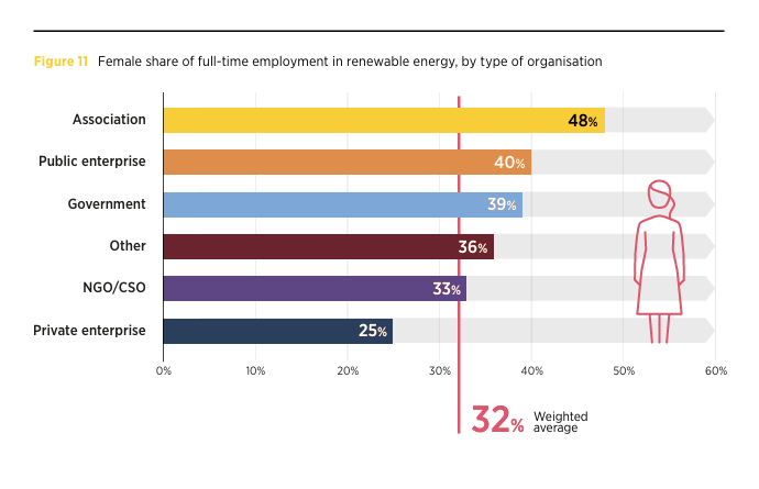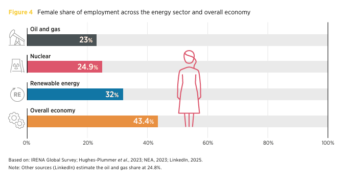 Uprkos pozitivnim trendovima zapošljavanja, žene su i dalje nedovoljno zastupljene. One čine 32% zaposlenih na puno radno vreme u sektoru OIE, što je više nego u naftnoj (23%) i nuklearnoj industriji (25%), ali i dalje ispod globalnog proseka učešća žena u ukupnoj radnoj snazi, koji iznosi 43,4%. Drugim rečima, gotovo svaka deveta potencijalna radnica nedostaje u sektoru obnovljivih izvora u poređenju sa ostatkom ekonomije.