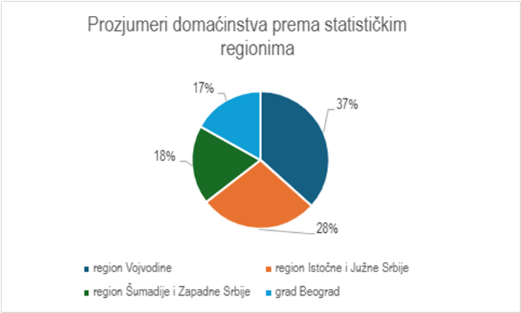 Regionalna raspodela domaćinstava-prozjumera je sledeća: Vojvodina ima najveći udeo od 36,7%, prate je Istočna i Južna Srbija sa 27,8% i Šumadija i Zapadna Srbija 18,6%, dok grad Beograd učestvuje sa svega 16,9%.