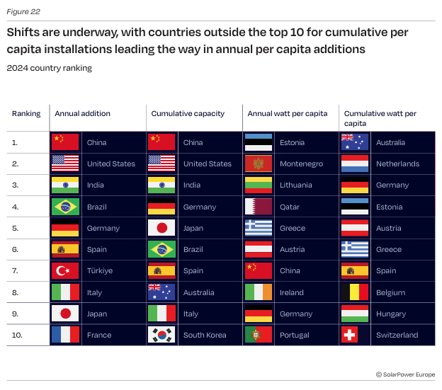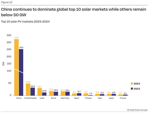 U 2024. godini došlo je do značajnih promena na globalnom solarnom tržištu. Kina je instalisala novih 329 GW solara, što je više od dvostruko više kapaciteta od svih ostalih zemalja iz top 10 zajedno. Slede je Sjedinjene Američke Države (50 GW) i Indija (30,7 GW).