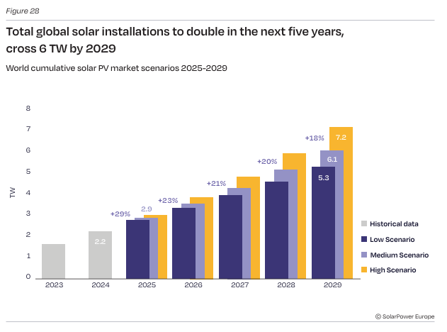 Nakon dostizanja 2 TW ukupne instalisane snage solarne energije u 2024. godini, globalni solarni PV kapaciteti će se značajno povećati, a ukupni kapacitet se predviđa da će dostići 2,9 TW u 2025. godini. U srednjem scenariju koji predviđa SolarPower Europe, očekuje se da će ukupni kapacitet dalje rasti na 3,6 TW u 2026. godini, 4,3 TW u 2027. godini, 5,2 TW u 2028. i 6,1 TW do 2029. godine. Ove brojke ostaju u velikoj meri usklađene sa prošlogodišnjim projekcijama Global Market Outlook.