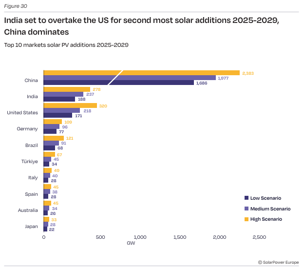 Projekcije pokazuju da će se globalna instalacija solarne energije značajno promeniti u narednih pet godina. Kina će zadržati dominantnu poziciju, sa očekivanih 2 TW novog kapaciteta u periodu 2025-2029, dok Indija preuzima drugo mesto, nadmašujući Sjedinjene Američke Države (218 GW) sa predviđenih 237 GW novih instalisanih kapaciteta.