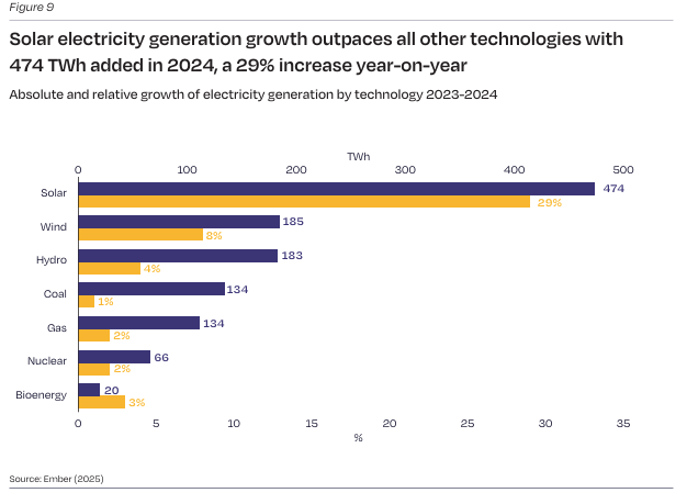 Rast proizvodnje solarne električne energije nadmašuje sve ostale tehnologije sa 474 TWh dodatih u 2024. godini, što je povećanje od 29% u odnosu na prethodnu godinu