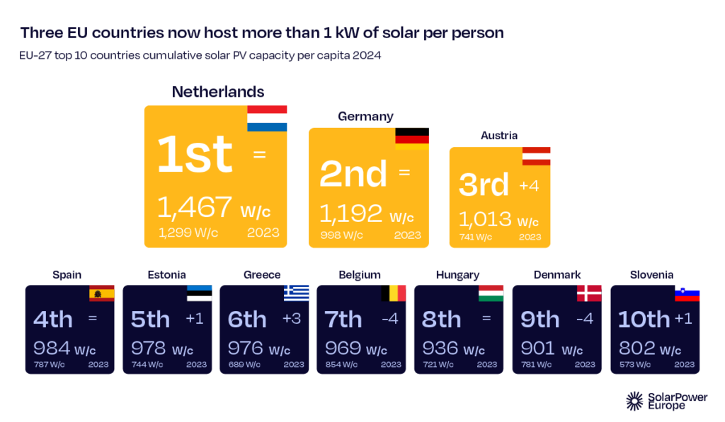 Na nacionalnom nivou, pet od deset najboljih solarnih tržišta u 2024. godini instaliralo je manje solarne energije nego u 2023. godini – Španija, Poljska, Holandija, Austrija i Mađarska. Ostala vodeća tržišta – Nemačka, Italija, Francuska, Grčka i Portugal ponudili su skroman rast, a većina je instalirala oko 1 GW više nego prethodne, 2023. godini.