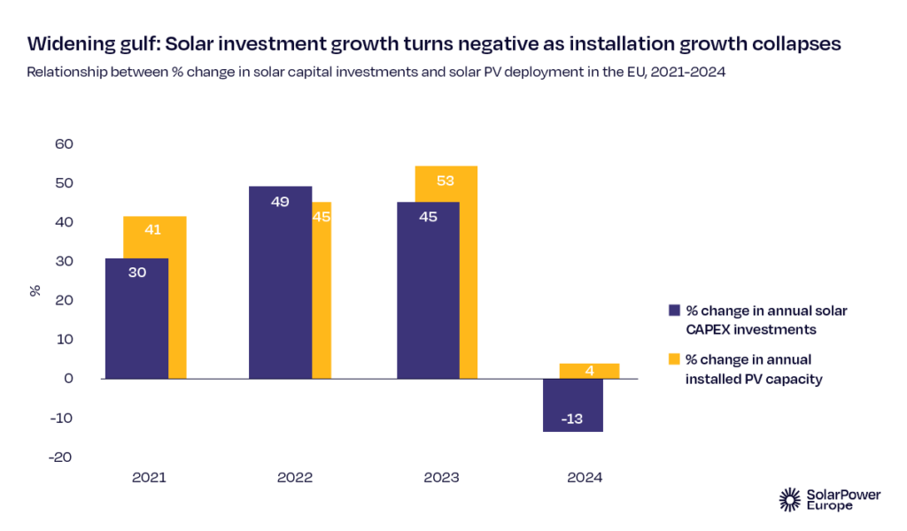 Prema novom izveštaju, 2024. godina označava prvu godinu u kojoj su godišnje investicije u solarne instalacije u EU pale, u odnosu na period 2020-2023. Pad od 13% na 55 milijardi evra pripisuje se padu cena komponenti koje smanjuju kapitalne izdatke.
