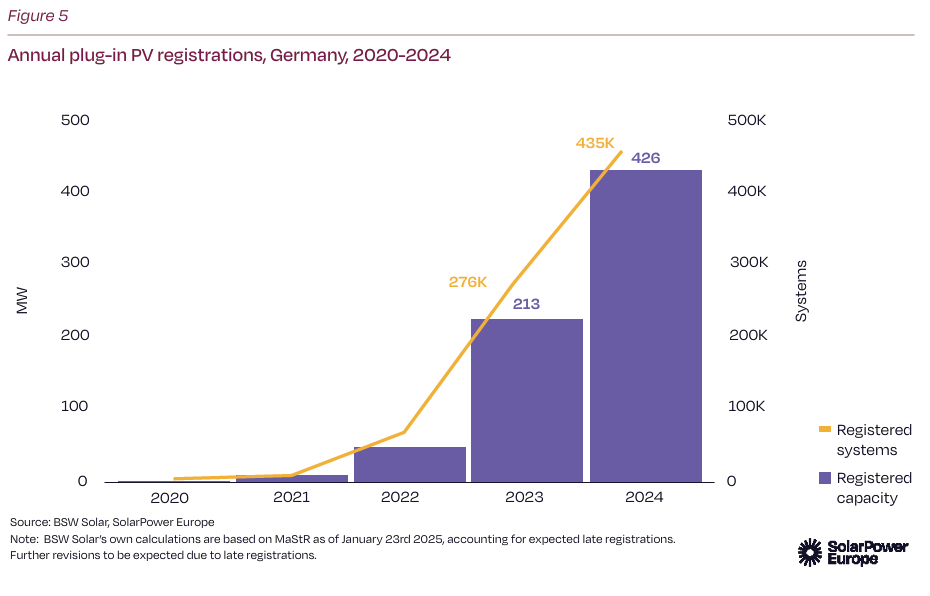 Plug-in PV tržište raste u Evropi, mada tačne brojke je teško otkriti.Nemačka prednjači sa preko 780.000 registrovanih plug-in PV sistema koji su se registrovali do kraja 2024. godine. Iz SolarPower Europe-a sugerišu da bi do 4 miliona sistema moglo biti u upotrebi u Nemačkoj, od kojih mnogi nisu registrovani.