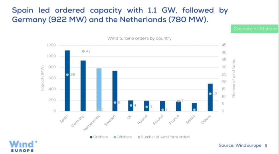 Španija predvodi naručeni kapacitet sa 1,1 GW (Izvor: WindEurope)