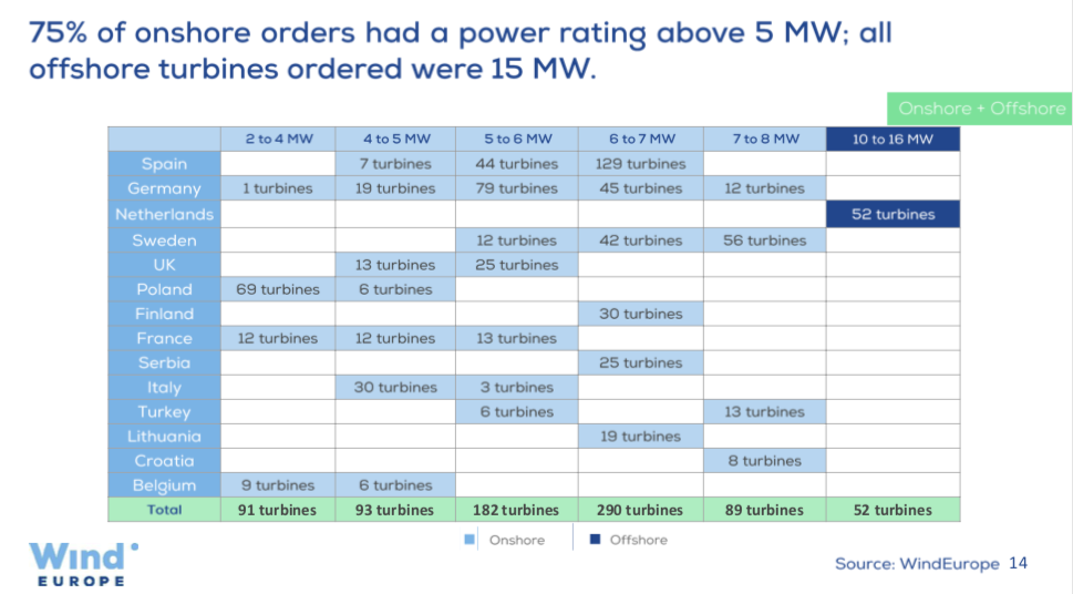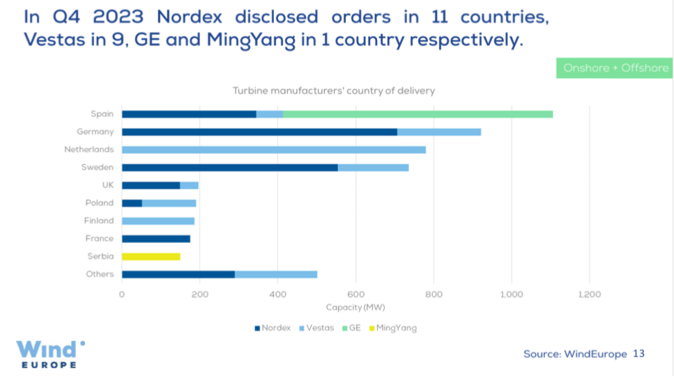 U četvrtom kvartalu 2023. godine Nordex je objavio porudžbine u 11 zemalja, Vestas u 9, GE i Ming Yang u po jednoj zemlji. Zanimljivo je i da je sve turbine u Francuskoj u poslednjem kvartalu prošle godine isporučio Nordex, a u Holandiji i Finskoj Vestas. Tri četvrtine naručenih turbina ima snagu iznad 5 MW.
