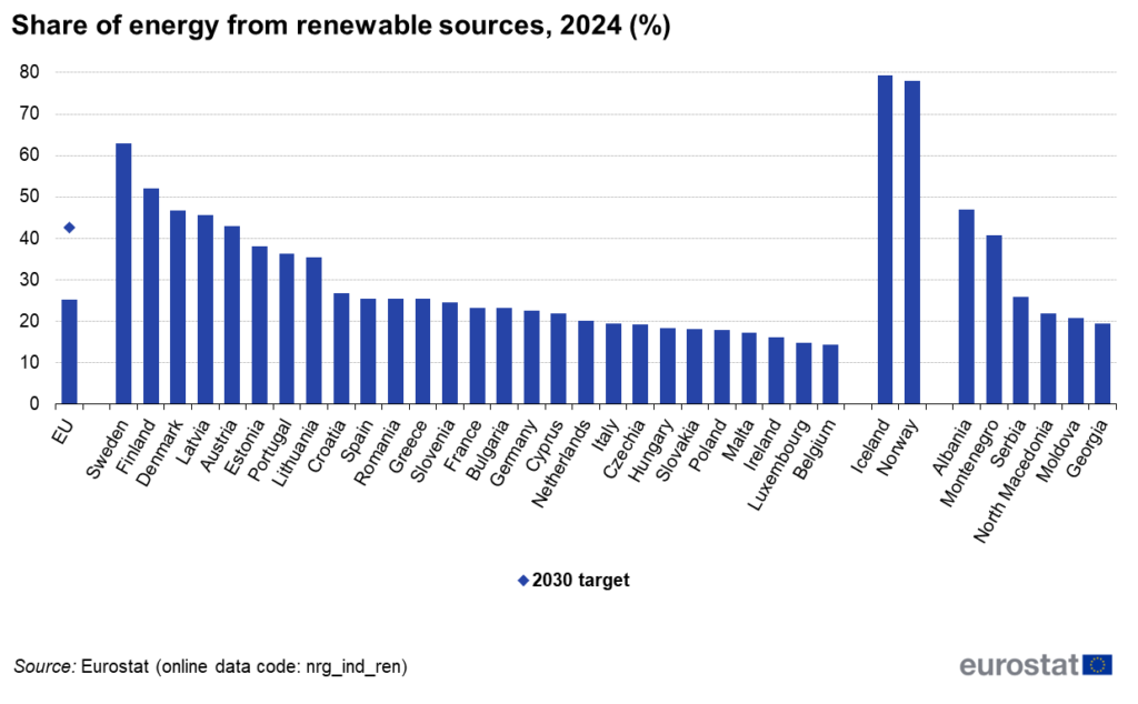 Među zemljama članica Evropske unije, Švedska je zabeležila najveći udeo obnovljivih izvora u bruto finalnoj potrošnji energije, čak 62,8%. Švedska se prvenstveno oslanjala na čvrstu biomasu, hidroenergiju i vetar. Finska je sledila sa 52,1%, oslanjajući se na čvrstu biomasu, vetar i hidroenergiju, dok je Danska bila treća sa 46,8%, pri čemu je većina obnovljive energije dolazila iz čvrste biomase, vetra i biogasa. Najniži udeli obnovljivih izvora zabeleženi su u Belgiji (14,3%), Luksemburgu (14,7%) i Irskoj (16,1%).