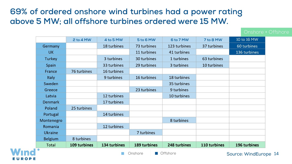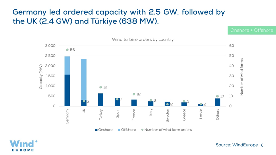 Najviše vetroturbina naručeno je u Nemačkoj (2,5 GW), dok je Ujedinjeno Kraljevstvo zauzelo drugo mesto sa 2,4 GW. Turska je treća sa 638 MW novih narudžbina. Značajne narudžbine offshore vetroelektrana zabeležene su u Ujedinjenom Kraljevstvu i Nemačkoj, gde su zaključene tri velike narudžbine ukupne snage 2,9 GW.