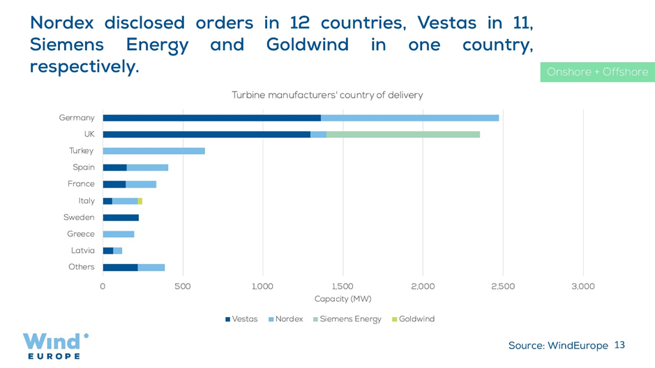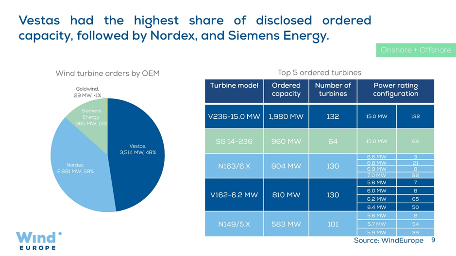 Među proizvođačima vetroturbina, kompanija Vestas ostvarila je najveći udeo u narudžbinama sa 48%, dok je slede Nordex sa 39% i Siemens Energy sa 13%. Kineski Goldwind imao je minimalan udeo ispod 1%.