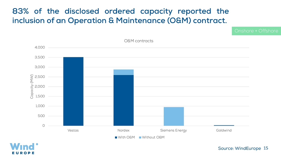 Ugovori o radu i održavanju (O&M) bili su deo 83% ukupno naručenog kapaciteta u Q4 2024. Više od 2,7 GW vetroturbina obuhvatilo je dugoročne O&M ugovore od najmanje 20 godina.