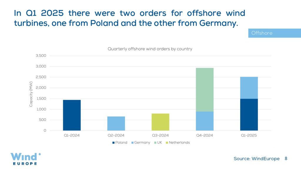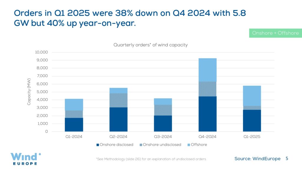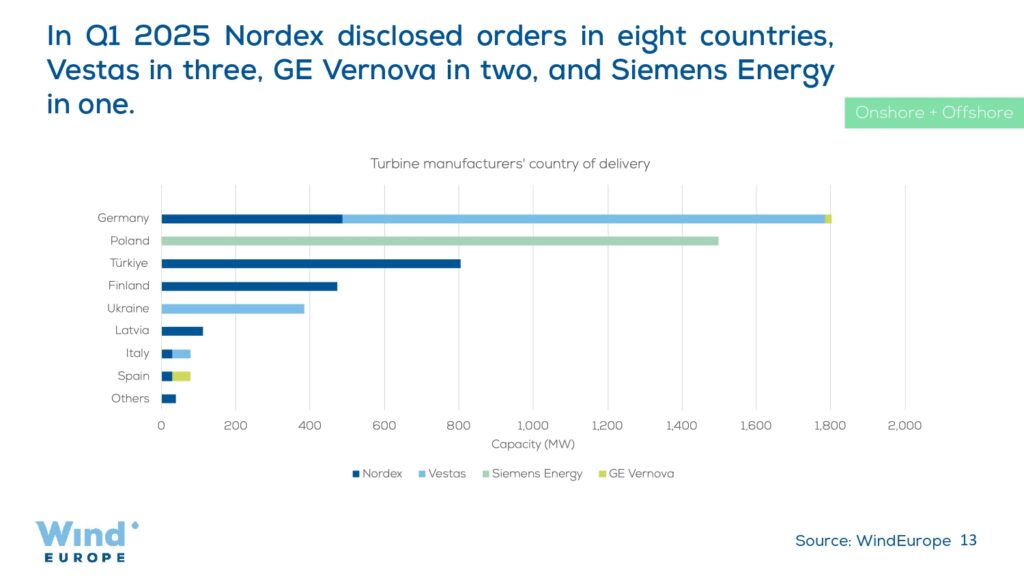 U prvom kvartalu 2025. godine 10 evropskih zemalja naručilo je vetroturbine kapaciteta 5,8 GW, što je pad od 38% nego u prethodnom kvartalu, pokazuju statistički podaci za period januar-mart 2025. godine koje je predstavio WindEurope, vodeća evropska asocijacija za energiju vetra čiji je OIE Srbija član. Srbija ni u ovom kvartalu nije deo izveštaja WindEurope.