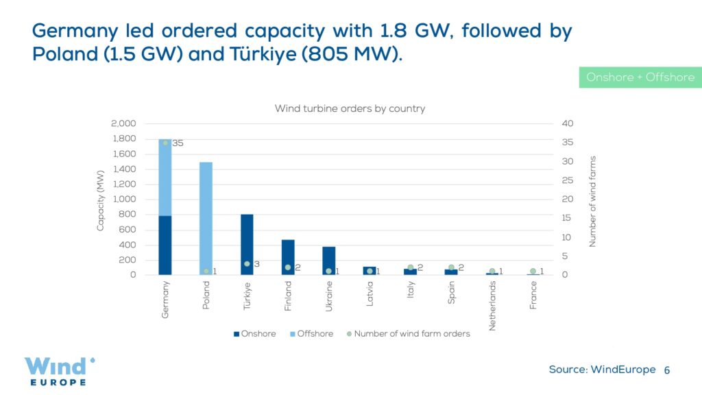 Prema izveštaju, Nemačka je u prvom kvartalu ove godine predvodila po naručenom kapacitetu sa 1,8 GW, dok je sledi Poljska sa 1,5 GW, a Turska sa naručenih 805 MW.