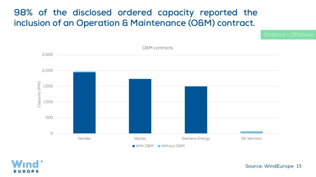 Važan trend koji se nastavlja je i prisustvo ugovora o održavanju: čak 98% otkrivenih porudžbina uključivalo je Operation & Maintenance (O&M) ugovore, što pokazuje rastući značaj dugoročnog održavanja u sektoru vetroenergije.